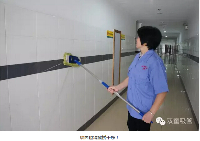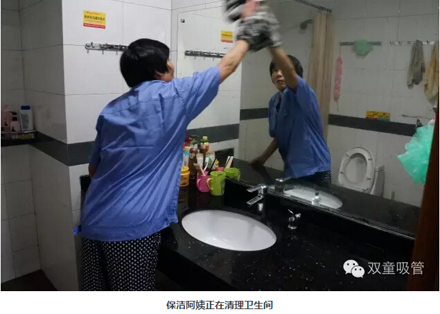 首先吸管妞就從衛生保潔工作說(shuō)起,每天清晨,保潔阿姨就已經(jīng)將員工寢室的通道打掃地干干凈凈了。墻面上的每一塊瓷磚都得用布拖把擦拭干凈,不能留下一點(diǎn)灰塵!