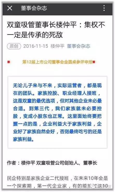 無(wú)論兒子來(lái)與不來(lái),實(shí)際運營(yíng)者,都是現在的團隊。家族控股、職業(yè)經(jīng)理人接班,這是“雙童”的最優(yōu)選項,但對其他企業(yè)未必最合適。到第三代,我們家族就未必要控股,變成小股東也正常。這里面始終要把握一點(diǎn)的是,企業(yè)利益大于家族利益,企業(yè)好了家族自然會(huì )好,否則最終吃虧的還是家族利益。一般來(lái)講,企業(yè)的創(chuàng )始人總是希望企業(yè)能持續地傳承下去,而這里所指的“傳承”并非一定要子女接班,我認為這才是理性的商業(yè)思維。