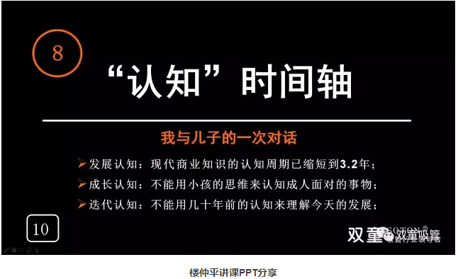 “認知”時(shí)間軸:“雙童”樓仲平通過(guò)自己與兒子的一次對話(huà)認知到不能用慣性思維來(lái)認知我們的下一代。樓仲平的成長(cháng)也伴隨著(zhù)不斷的否定,在認知、糾錯、不斷改變下實(shí)現自我成長(cháng)。“創(chuàng )業(yè)者”最應該有“時(shí)間軸”的概念,需要擁有自我蛻變的能力,否則你就很難成長(cháng)!
