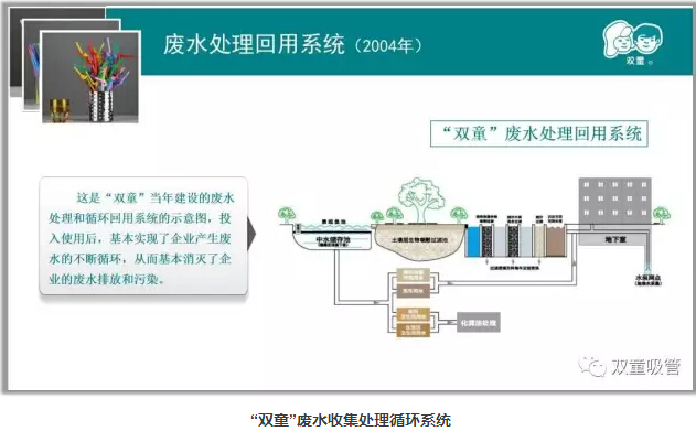 所謂“廢水收集處理循環(huán)回用系統”,其實(shí)就是將員工的生活廢水過(guò)濾后匯聚到“ 雙童一號樹(shù)”下進(jìn)行生物吸附處理,再流入中水儲存池,并為廠(chǎng)區所有衛生間的馬桶沖水、綠化噴淋和道路清洗、車(chē)輛清洗所用,使公司的員工生活用水量節省了65%,每年為公司節省水費支出40多萬(wàn)元!
