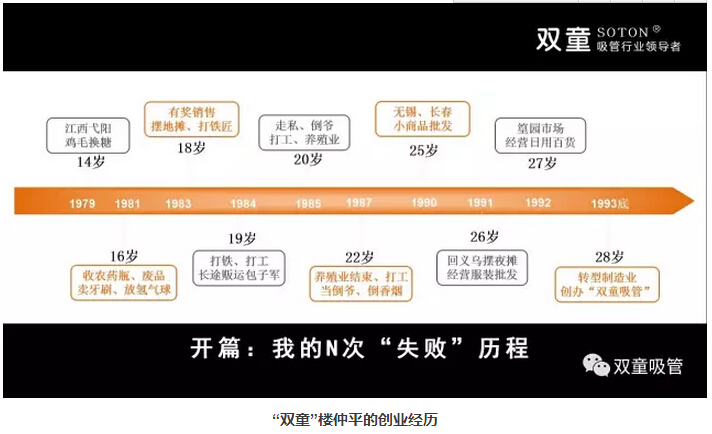 “雙童”樓仲平一開(kāi)始出生在極端貧困中,初中輟學(xué),身為熱播電視劇《雞毛飛上天》男主角陳江河的原型人物之一,樓仲平從14歲跟隨父親去江西“雞毛換糖”,在“雞毛換糖”的過(guò)程當中勇于創(chuàng )新,持續折騰。在1979-1994年期間做了二十多個(gè)行當,打工、創(chuàng )業(yè),還養過(guò)魚(yú),經(jīng)過(guò)多次失敗后終于在吸管這個(gè)行業(yè)上扎根。