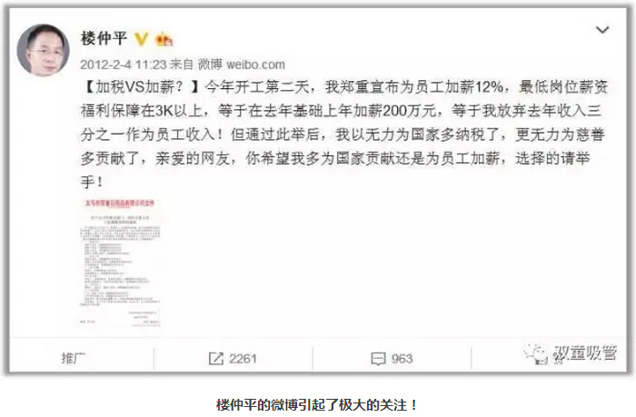 通過(guò)對經(jīng)營(yíng)模式的創(chuàng )新改變,“雙童”創(chuàng )造了差異化亮點(diǎn),引發(fā)了大批媒體的關(guān)注和報道。這讓“雙童”樓仲平體會(huì )到了社會(huì )關(guān)注對“雙童”品牌的助推作用,也引發(fā)了“如何不花一分錢(qián)去引導媒體關(guān)注”的思考。2009年,新浪微博應運而生,深受互聯(lián)網(wǎng)影響的“雙童”樓仲平成為了首批受邀開(kāi)通的博主,并注冊了個(gè)人微博和“雙童”企業(yè)微博。在寫(xiě)微博期間,由于當時(shí)他寫(xiě)的微博更多是企業(yè)管理認知和中小企業(yè)思考的話(huà)題,所以寫(xiě)這些博文時(shí)需要查閱大量的資料和信息,這也促進(jìn)了樓仲平更快的提升。同時(shí),他寫(xiě)的微博也得到了社會(huì )各界的極大關(guān)注,乃至于一年多時(shí)間寫(xiě)到了當時(shí)金華地區微博流量最大的民營(yíng)企業(yè)主之一。