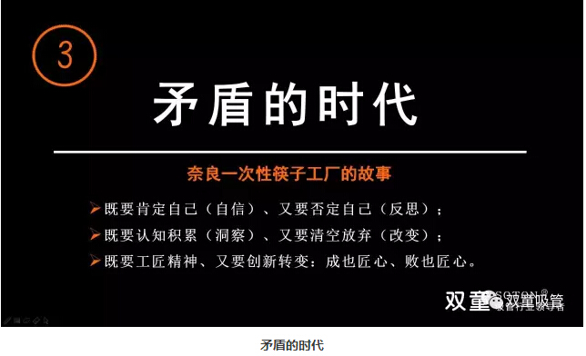 “雙童”樓仲平通過(guò)日本奈良一次性筷子的故事告訴大家成也工匠精神、敗也工匠精神,沒(méi)有改變,“工匠”精神也沒(méi)有用。作為創(chuàng )業(yè)者來(lái)講,我們不能用過(guò)往的經(jīng)驗來(lái)理解發(fā)生的一切,否則你會(huì )被時(shí)代所拋棄。在不同的時(shí)代,你對時(shí)間和技術(shù)進(jìn)步的理解是不一樣的,既要肯定自己、又要否定自己;既要認知積累、又要清空放棄;既要工匠精神、又要創(chuàng )新轉變!