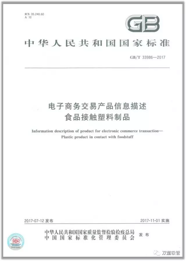 2014年11月3日,由“雙童”主導起草的《電子商務(wù)交易產(chǎn)品信息描述 食品接觸塑料制品》國家標準正式立項,并于2016年3月于北京通過(guò)專(zhuān)家評審,2017年正式發(fā)布,標準號GB/T 33986-2017,該標準的發(fā)布實(shí)施,標志著(zhù)“雙童”在標準戰略工作中由起草單一的產(chǎn)品技術(shù)標準向系統的信息應用標準轉變,為中小企業(yè)參加國家標準的起草工作樹(shù)立了一個(gè)新的方向。
