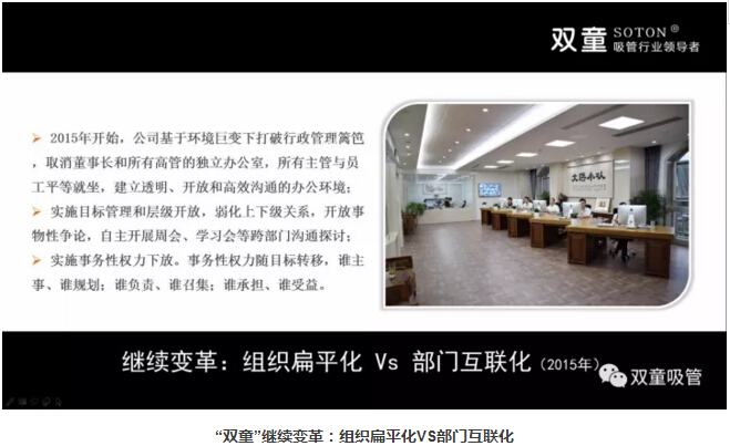 基于時(shí)代的改變和挑戰,“雙童”在2015年對組織形式做出新的變革,打破行政管理籬笆,通過(guò)平等、透明、開(kāi)放的辦公環(huán)境,消除部門(mén)之間的隔閡,實(shí)施目標管理和層級開(kāi)放,弱化上下級關(guān)系,自主開(kāi)展周會(huì )等跨部門(mén)溝通探討,提升部門(mén)工作效率。同時(shí),實(shí)施事務(wù)性權力下放,大家以解決事務(wù)為核心,讓權力隨事務(wù)轉移,誰(shuí)主事、誰(shuí)規劃;誰(shuí)負責、誰(shuí)召集;誰(shuí)承擔、誰(shuí)受益,一切以工作結果為導向,也實(shí)現了跨部門(mén)互通互聯(lián)、共同探討!