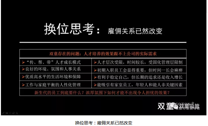 “雙童”經(jīng)歷團隊“蛻變”后,通過(guò)學(xué)習會(huì )意識引導、推動(dòng)家文化人性管理以及全方位改善員工的生活生產(chǎn)環(huán)境,提升團隊認知意識和凝聚力!經(jīng)歷“蛻變” 后團隊凝聚力確實(shí)有所提升,但客觀(guān)上基層員工的流動(dòng)性依然較大,對高端人才引進(jìn)還是沒(méi)有太大吸引力,企業(yè)的持續發(fā)展明顯存在著(zhù)天花板瓶頸。
