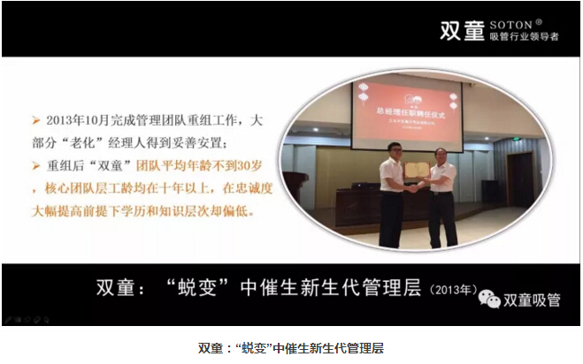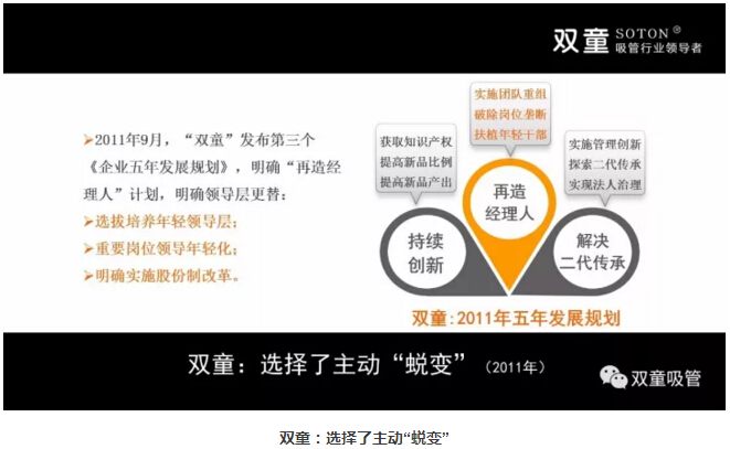 “雙童”選擇了主動(dòng)“蛻變”:基于上述瓶頸,公司在2011年發(fā)布了第三個(gè)《企業(yè)五年發(fā)展規劃》,明確“再造經(jīng)理人”計劃,明確領(lǐng)導層更替:選拔培養年輕領(lǐng)導層、重要崗位領(lǐng)導年輕化、明確實(shí)施股份制改革,慢慢解決管理層老化問(wèn)題!重組后的“雙童”團隊平均年齡不到三十歲,大部分核心團隊的工齡在十年以上,學(xué)歷、知識層次和忠誠度大幅提高!