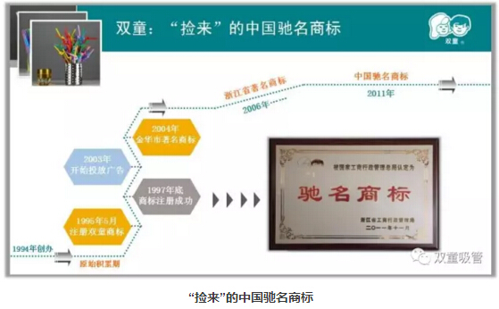 于是,樓仲平就拿著(zhù)這個(gè)圖案去找義烏工商局咨詢(xún),義烏工商局的科長(cháng)直接了當地告訴他,這一定是已經(jīng)注冊過(guò)的商標了!但樓仲平并不死心,花了三百塊錢(qián)查詢(xún)費要求科長(cháng)在電腦上查一下,經(jīng)過(guò)查證之后發(fā)現這個(gè)商標還真沒(méi)有人注冊,于是,樓仲平立馬帶著(zhù)相關(guān)證件,用了2000元搶占先機,把這個(gè)圖案注冊為商標。在確定商標名稱(chēng)時(shí),根據圖案上兩個(gè)兒童的標志,樓仲平夫婦將“雙童”確定為商標的名字。正是樓仲平的這次舉措,“撿來(lái)”了“雙童”的中國馳名商標,也邁出了企業(yè)的品牌建設發(fā)展最為關(guān)鍵的一步,改變企業(yè)命運的同時(shí)也提升了整個(gè)行業(yè)的認知!