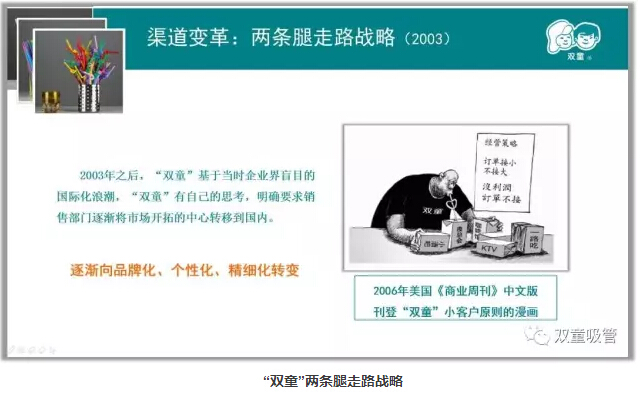 同時(shí),“雙童”也利用互聯(lián)網(wǎng)的優(yōu)勢,先后投入數千萬(wàn)資金用于“雙童”品牌的塑造和國內市場(chǎng)的渠道建設,持續尋找如酒店、夜總會(huì )、KTV、咖啡廳等中高端消費場(chǎng)所的小訂單,爭取到了大量原被傳統制造企業(yè)忽視的小客戶(hù)群體,開(kāi)始實(shí)施“小客戶(hù)原則”的經(jīng)營(yíng)戰略。