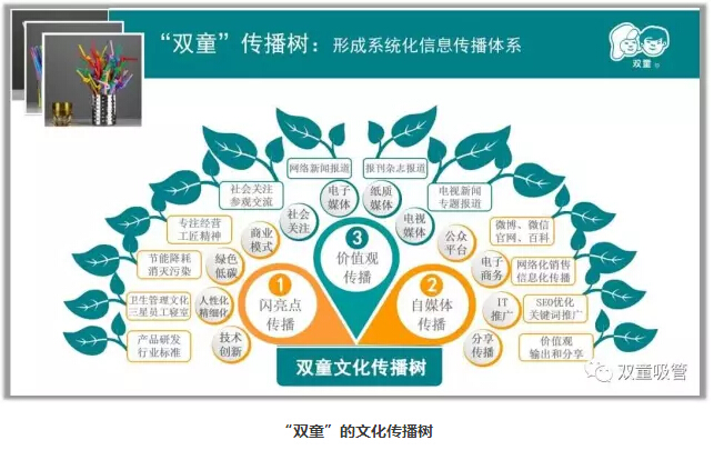 左邊是閃亮點(diǎn)的傳播介紹,包括了綠色制造、節能降耗、精細化管理以及技術(shù)創(chuàng )新等內容。右邊通過(guò)微博、微信、博客、官網(wǎng)、百科等制造話(huà)題,即時(shí)發(fā)布博文、軟文、帖子等內容,并進(jìn)行互聯(lián)網(wǎng)、IT推廣、展位推廣等自媒體的傳播。上邊則是政府、媒體關(guān)注的價(jià)值觀(guān)傳播。三大部分組成了“雙童”的文化傳播樹(shù)!