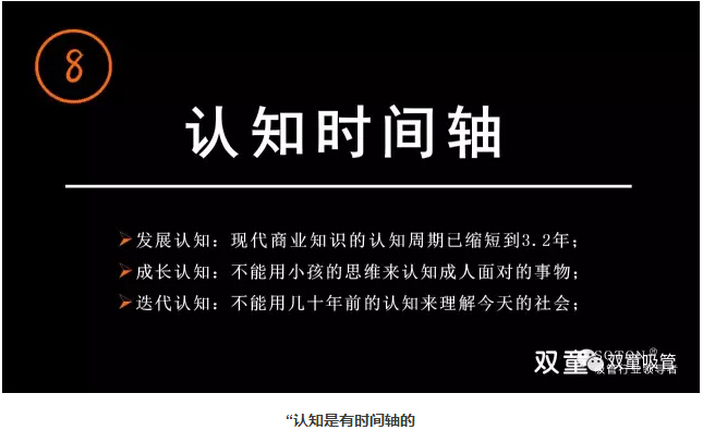>>> “認知”時(shí)間軸:現代商業(yè)知識的認知周期已縮短到3.2年,我們不能用小孩的思維來(lái)認知成人面對的事物,更不能用幾十年前的認知來(lái)理解今天的社會(huì )。每個(gè)人的成長(cháng)伴隨著(zhù)不斷的否定,在認知、糾錯、不斷改變下實(shí)現自我成長(cháng)。“創(chuàng )業(yè)者”最應該有“時(shí)間軸”的概念,需要擁有自我蛻變的能力,否則你就很難成長(cháng),我們應該拋棄固有的認知,保持終身學(xué)習,建立與年輕人溝通與對話(huà)的能力,不斷認知升級接受不斷變化和挑戰,迎合這個(gè)時(shí)代的發(fā)展!