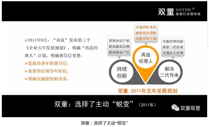 公司創(chuàng )辦初期聘任部分原國營(yíng)企業(yè)的下崗管理層,這些人客觀(guān)上在企業(yè)發(fā)展中做出了巨大的貢獻。但2010年前后,其中的大部分管理層逐漸出現了“認知時(shí)間軸瓶頸”,他們完全憑經(jīng)驗用老方法解決新問(wèn)題,拒絕接受和應用新興事物,團隊的成長(cháng)遇到了瓶頸。因此,“雙童”決定重新梳理團隊,在2011年發(fā)布了第三個(gè)《企業(yè)五年發(fā)展規劃》,明確“再造經(jīng)理人”計劃,明確領(lǐng)導層更替:選拔培養年輕領(lǐng)導層、重要崗位領(lǐng)導年輕化、明確實(shí)施股份制改革,慢慢解決管理層老化問(wèn)題!重組后的“雙童”團隊平均年齡不到三十歲,大部分核心團隊的工齡在十年以上,學(xué)歷、知識層次和忠誠度大幅提高!