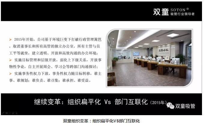 在團隊重塑之后,為了提高團隊溝通效率。“雙童”從2015年開(kāi)始,對原有組織形式進(jìn)行思考、實(shí)踐和探索,逐漸打破行政管理籬笆,通過(guò)平等、透明、開(kāi)放的辦公環(huán)境,消除部門(mén)之間的隔閡,實(shí)施目標管理和層級開(kāi)放,弱化上下級關(guān)系,自主開(kāi)展周會(huì )等跨部門(mén)溝通探討,提升部門(mén)工作效率。同時(shí),實(shí)施事務(wù)性權力下放,大家以解決事務(wù)為核心,讓權力隨事務(wù)轉移,誰(shuí)主事、誰(shuí)規劃;誰(shuí)負責、誰(shuí)召集;誰(shuí)承擔、誰(shuí)受益,一切以工作結果為導向。這種從思維到組織結構的創(chuàng )新工作方式,實(shí)現了跨部門(mén)互通互聯(lián)、共同探討,大大提升了企業(yè)工作效率!