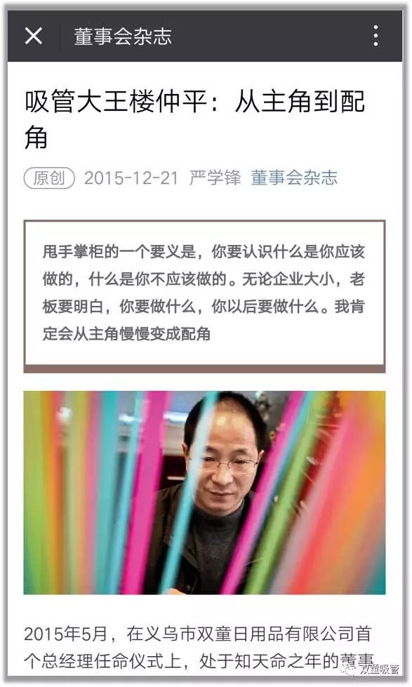 1994年成立的雙童是全球最大的吸管企業(yè)之一、業(yè)內“隱形冠軍”,由創(chuàng )始人樓仲平夫婦100%持股。近年來(lái),樓仲平大力健全職業(yè)經(jīng)理人制度、培養團隊,思考員工持股;另一方面,他不斷調整自己的角色,用他自己的話(huà)說(shuō)“從主角轉變?yōu)榕浣?/span>”。