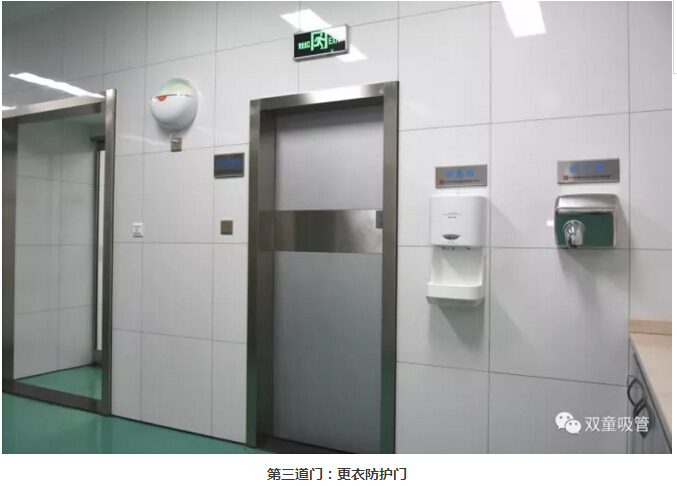 3.經(jīng)過(guò)了兩道防護門(mén)后,員工們更衣后通過(guò)更衣防護門(mén)進(jìn)入洗手消毒區域。