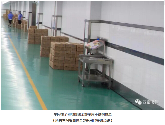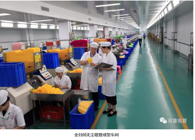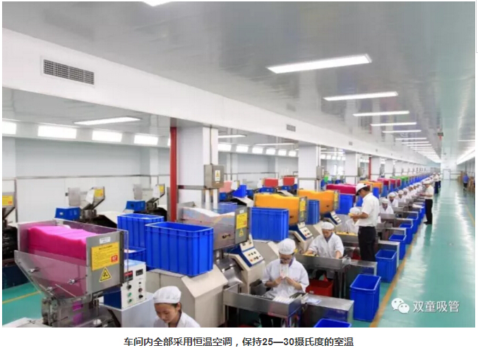 “雙童”車(chē)間的每個(gè)入口,有著(zhù)許多安全、衛生提示的標牌,引導員工門(mén)在進(jìn)入車(chē)間時(shí)要注意安全和衛生防護工作。進(jìn)入車(chē)間內部,一列列整齊的機器、一箱箱五顏六色的吸管、一條條清晰分明的分界線(xiàn),車(chē)間內全部安裝了恒溫空調,屋頂全部進(jìn)行精裝修寬敞明亮,柱子和地腳線(xiàn)用不銹鋼進(jìn)行包邊,大大增加了建筑年限。所有員工皆穿著(zhù)潔白的工作服,正在忙碌地進(jìn)行生產(chǎn)工作。