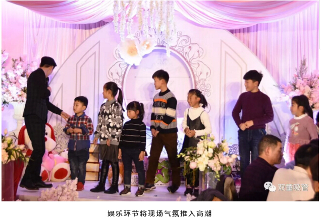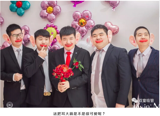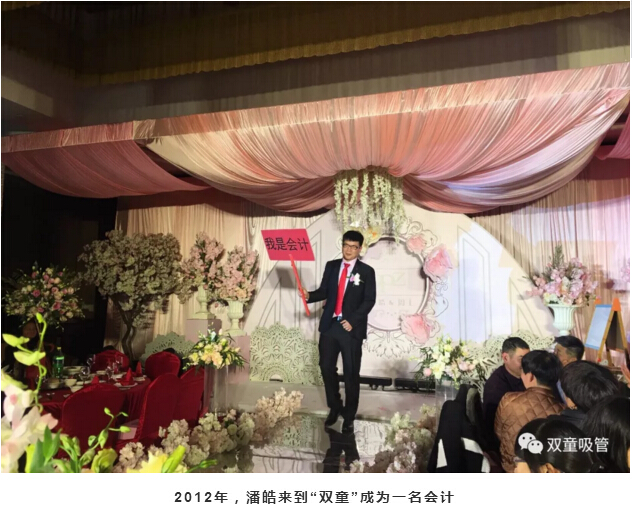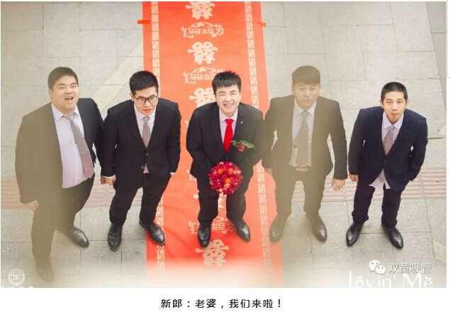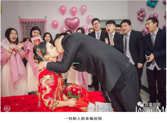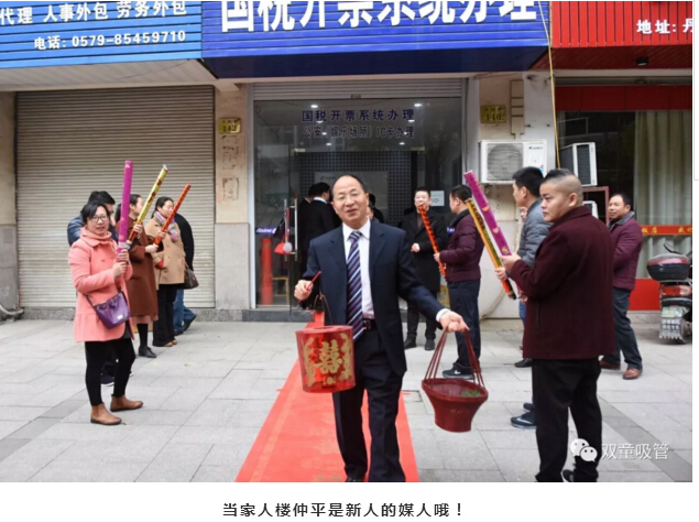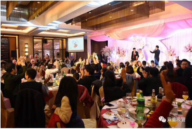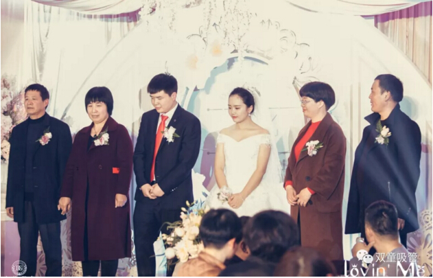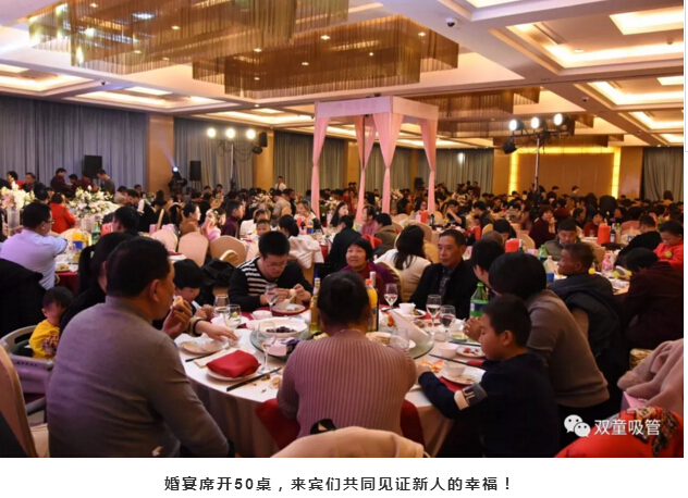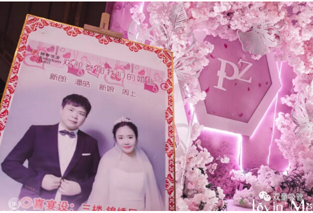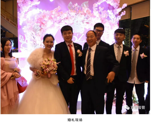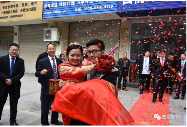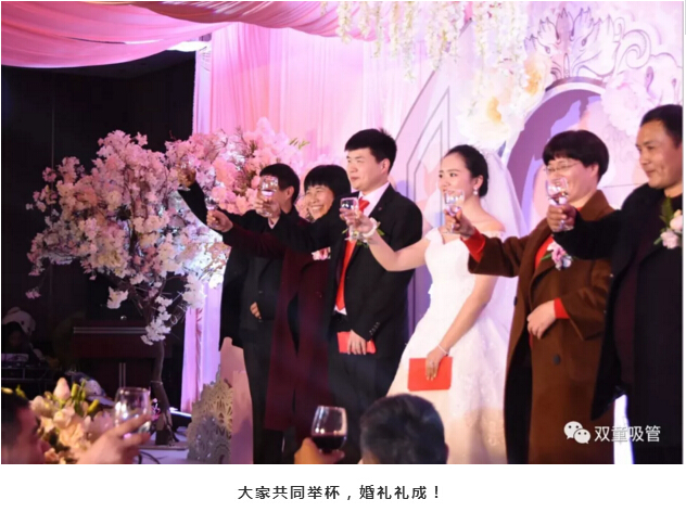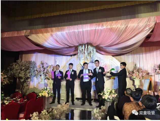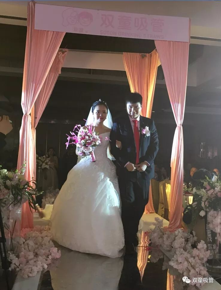 婚禮現場(chǎng)的亭子代表著(zhù)新人的工作單位——“雙童吸管”